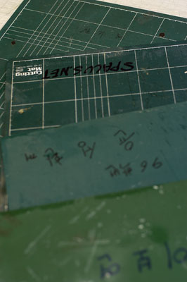 지하 모형 제작실 발굴을 마치고 발견한 4장의 칼판 – 커팅 매트라는 학술 용어로도 불리운다 – 에는 칼판의 소유자로 추정되는 5명의 이름이 적혀있었는데 그들은 모두 이름앞에 96이라 적고 있으니.