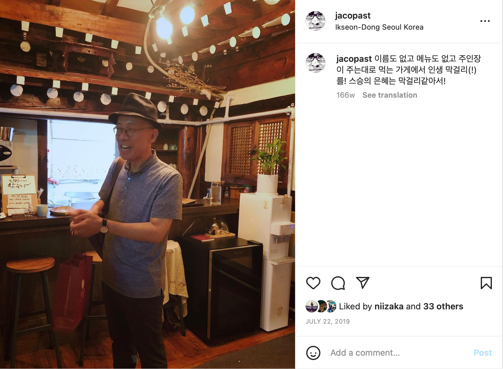 특별히 간판도 메뉴도 없는 아는 사람만 가는 가겐데 특별한 막걸리와 소주를 마셨다. 영화사 대표라는 그 사장님은 새로 들어온 좋은 술과 술에 맞춘 적당한 안주를 내주셨다. 그리고 또 다른 테이블에서 다른 손님들과 술을 드시고 계셨다. 술맛을 모르는 나라서 맛있다고 홀짝홀짝 마시다가 훅갈까봐 조심했는데, 막걸리도 신기하고 소주도 진기했다. 알고보면 우리끼리 떠드느라 선생님이 말씀하실 기회를 많이 안드린 듯.